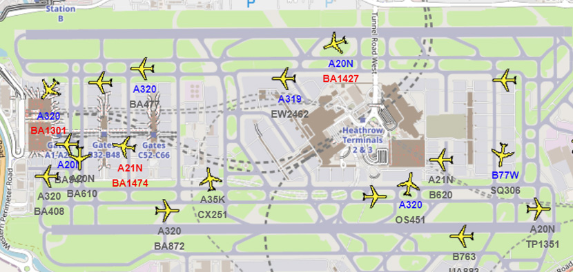 | Live Traffic with Red text showing models not downloaded Blue Arriving Planes |