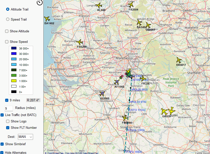 | Traffic Flying to destination (MAN) are marked with a blue flattened circle |